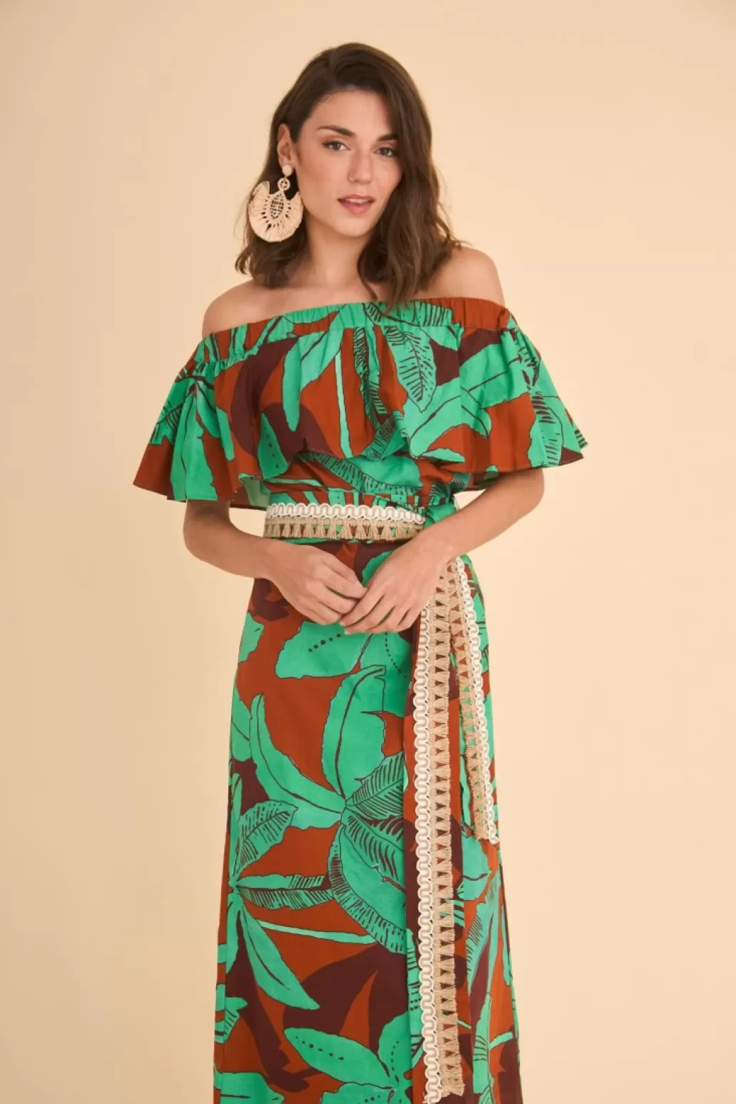 Cinturón ondulado confeccionado en piel color camel. Cierre delantero con hebilla dorada.