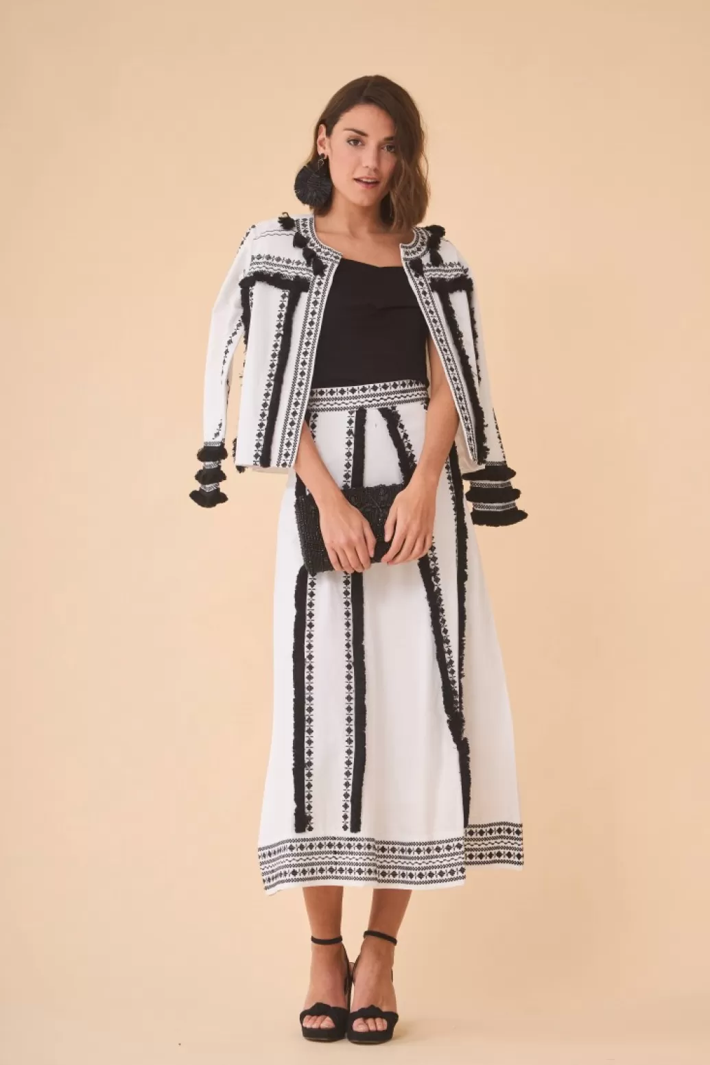 Falda midi de tiro alto confeccionada en algodón color blanco. Detalle de flecos en la parte delantera y bordados en color negro en el bajo. Cierre con cremallera lateral invisible.