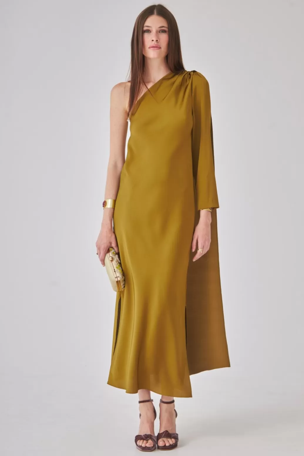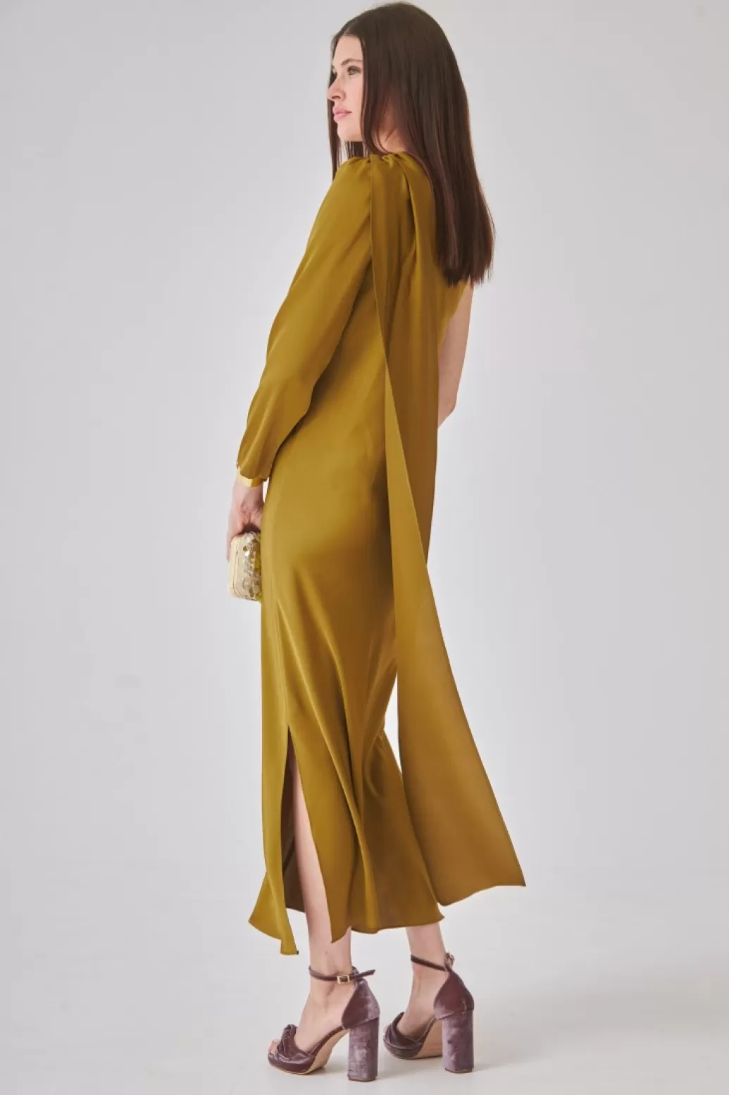 Vestido de fiesta largo confeccionado en tejido satinado color verde oliva. Escote asimétrico y manga larga. Corte amplio y suelto.